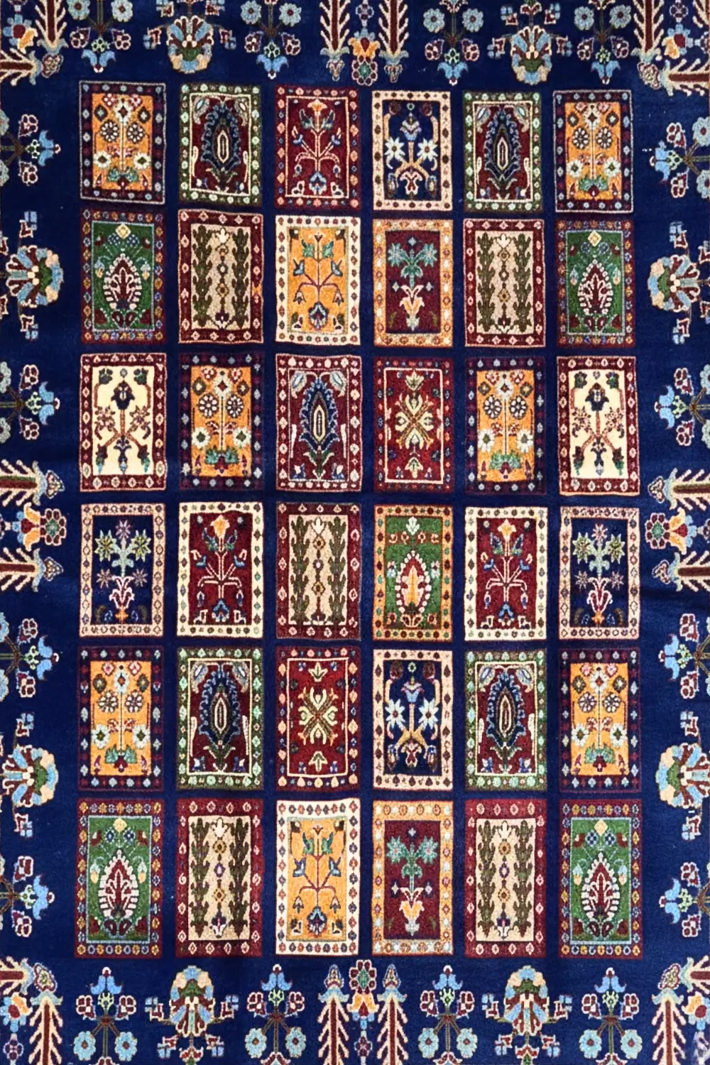 - This beautiful rug, measuring 5′ x 7′ in foot and 153 x 214 cm in centimetre, has a renowned Pashto design known for its geometric boxes.