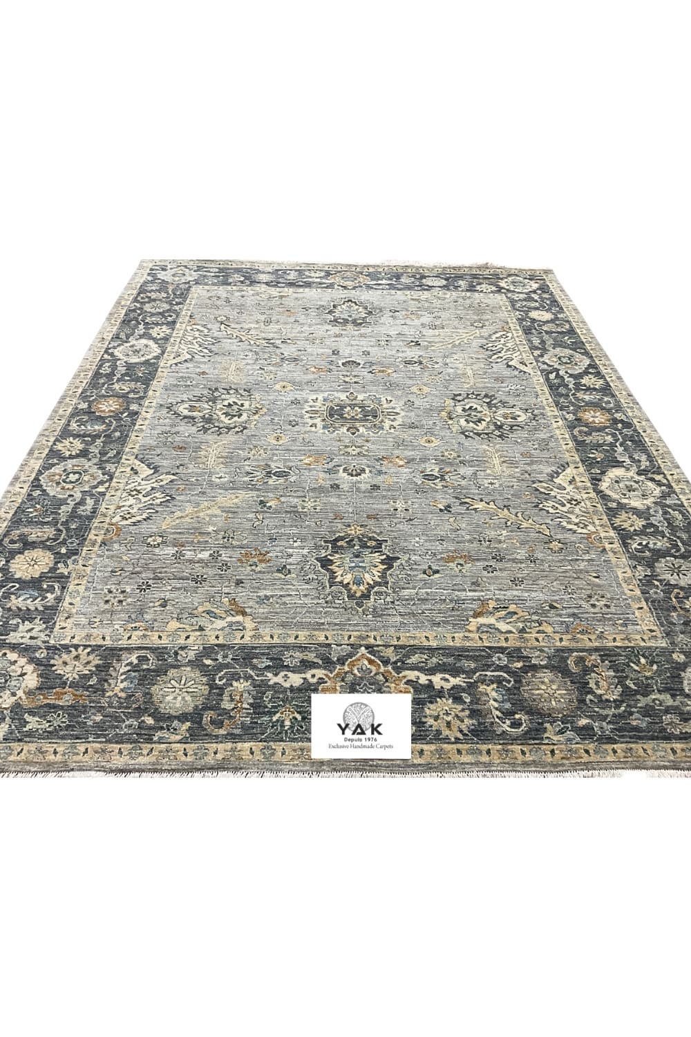 - This is a gorgeous handknotted oushak carpet with a greyish base, which is very lively and illuminating.